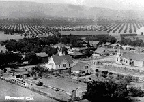 This is a view of Moorpark circa 1912. In the photo, taken from the northern end of town, you can clearly see the Methodist Church before it was added on to.