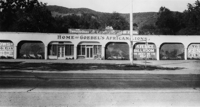 One of the subsequent owners of the Crowley House was Louis and Kathleen Goebel. In 1925, Goebel purchased former Newbury/Crowley land where the Thousand Oaks Civic Arts Plaza currently stands. It cost him $50. Louis Goebel soon opened Goebel's Lion Farm, where he trained lions and rented them to movie studios. As travelers passed through town, they wanted to see the animals. Goebel capitalized on this in 1929, when the site became "Goebel's Wild Animal Farm," a theme park that became very popular in the 1940s and 1950s. The 170 acre site housed all sorts of animals...elephants, tigers, giraffes, hippos, chimpanzees and more. Additionally, many TV shows and movies were filmed there, such as Tarzan, The Adventures of Robin Hood and Birth of a Nation. Goebel's Wild Animal Farm was home to Leo the Lion, of MGM Pictures fame.